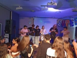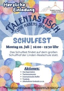Beim großen Schulfest 2023 kam die ganze Linden-Realschule zusammen. Aufgrund des schlechten Wetter, fand das Schulfest im Schulgebäude statt. Eltern, Schüler und Lehrer saßen zusammen, unterhielten sich mal nicht nur über den Schulalltag und ließen sich kulinarisch von der Schulgemeinschaft unter Unterstützung der Elternschaft verwöhnen. Außerdem wurde das Supertalent gesucht und wir hatten einen starken Auftritt des Voice-Seniors-Finalist Wolfang Schorer.